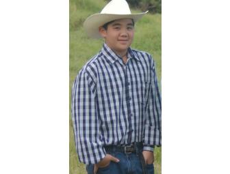 A hand-crafted navy blue, men's, palaka shirt. It has long sleeves and is finished with coconut buttons. Made here on the Big Island, this shirt is the perfect attire for a pa'ina up mauka.