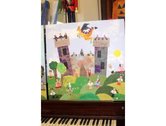 Description of Process: UNICOI prepared two 2x2 ft. wooden boards by sanding and priming them with gesso. Pictures were taken of each child. Headshots were superimposed into bodies wearing castle costumes. The children were divided into 3 groups to work on specific needs. All children rotated through: painting table where they brushed the blue sky paint with sponges; the people table where they glued their faces onto the wooden people and then dressed and adorned their people; the parts table where each child drew a rock or an animal on their hill. After all of the décor dried, the castle with all of its players was assembled with the end result being a wonder of magic, fable, and wonder!