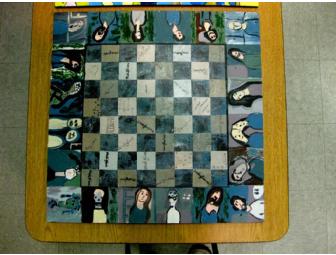 Project description: This group of artistic after-school students created these unique pieces of art by painting on wood using neutral tones—grays and browns scumbled in the center. The border is painted with portraits in the style of Italian artist, Amedeo Modigliani, who is known for elongating figures in his work. After the boards were painted, a bar top resin was added to protect the 4x4 ft. fanciful board from angry bishops, rooks, and queens!