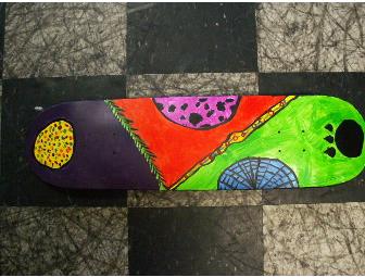 Description of Process: The fifth grade’s study of microscopes, lenses and field of view—combined with an introduction to Pop Art and artist Roy Lichtenstein—gave life to this art project! Students chose every day objects of interest and illustrated “magnified’ portions of the objects as if they were looking through a magnifying lens or microscope. Each student assumed a role of either layout artist, illustrator, or painter, according to artistic interest and proficiency. Using the backs of skateboard decks as their canvases, the layout artists chose the design, the illustrators drew onto the boards, and painters applied the medium. Six wicked cool Pop Art skateboard decks are the results of this highly collaborative effort. Each skateboard has grip tape on them so they’re ready to ride as soon as trucks, wheels, bearing, hardware are applied.