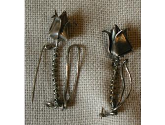 This traditional origami tulip is folded of fine silver metal clay and fired. The tulip shape is then attached to sterling silver wire for a leaf and clasp. 2 inches.