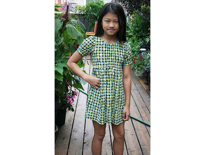 Short sleeve pull on dress with Pintuck details on front. Fun green print, great to wear in every season. This is a great dress ror the sporty girl who likes to dress up once in a while.
