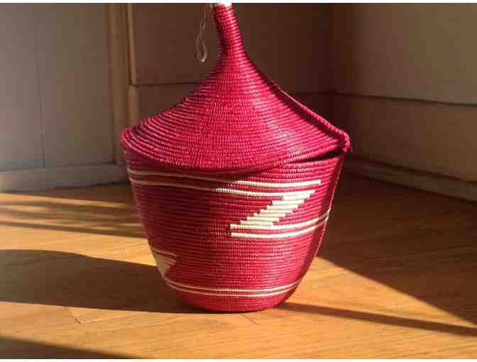 This red and white basket is approximately 9 1/2 inches high including the top. It's a vessel with infinite uses! They are painstakingly made by Ineza, a women's craft cooperative in Kigali, Rwanda, which WE-ACTx helped to establish. Their work results in economic self-sufficiency.