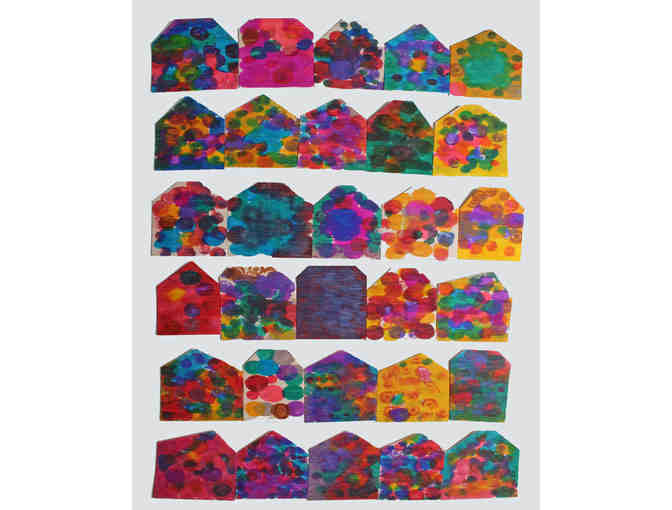 Each child decorated a balsa wood house in the style of their grade's artist. In lieu of a single class project to be auctioned, we have then taken your child(ren)s balsa wood house(s) and adhered them to custom cut matboard. (Available for purchase under "Custom Family Vignette" for $30.) Before creating the Vignettes, each grade's houses were grouped and photographed together as neighborhoods, and posters were created for each grade. You can buy a copy of your child's grade's poster for $30. (Or you can buy a copy of any grade's poster for that matter!!)