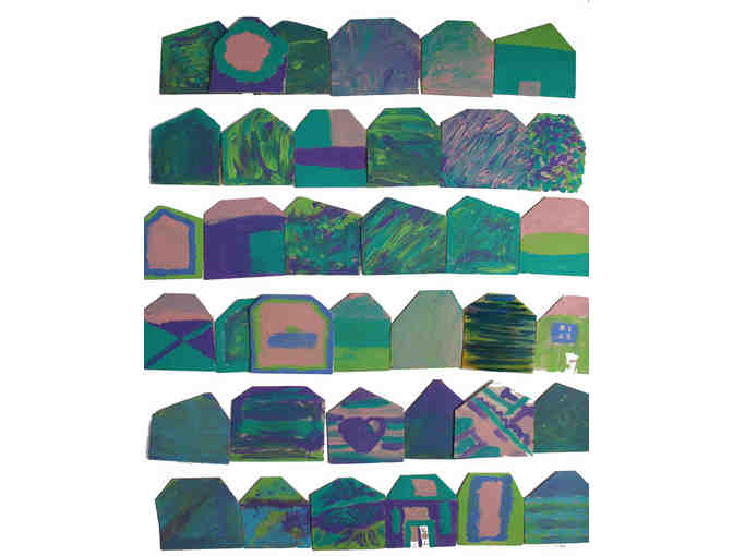 Each child decorated a balsa wood house in the style of their grade's artist.   In lieu of a single class project to be auctioned, we have then taken your child(ren)s balsa wood house(s) and adhered them to custom cut matboard.  (Available for purchase under "Custom Family Vignette" for $30.) Before creating the Vignettes, each grade's houses were grouped and photographed together as neighborhoods, and posters were created for each grade.  You can buy a copy of your child's grade's poster for $30.  (Or you can buy a copy of any grade's poster for that matter!!)