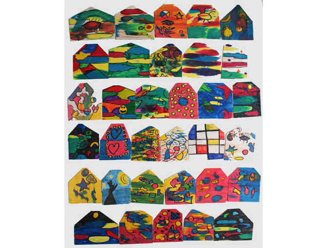 Each child decorated a balsa wood house in the style of their grade's artist.   In lieu of a single class project to be auctioned, we have then taken your child(ren)s balsa wood house(s) and adhered them to custom cut matboard.  (Available for purchase under "Custom Family Vignette" for $30.) Before creating the Vignettes, each grade's houses were grouped and photographed together as neighborhoods, and posters were created for each grade.  You can buy a copy of your child's grade's poster for $30.  (Or you can buy a copy of any grade's poster for that matter!!)