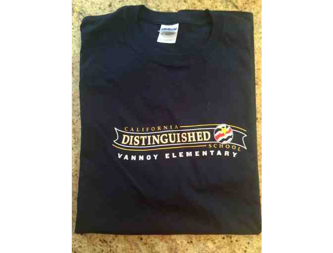 Adult size medium Vannoy CA Distinguished School Women's Cut Tee in dark blue.