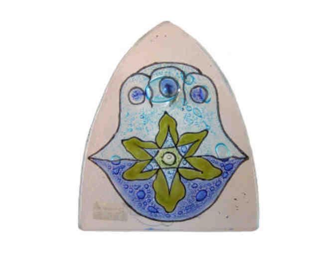 This beautiful hamsah night light was made by fair trade artisans in Ecuador, made from recycled glass and water based paint. It measures 4 1/2 inches tall x 4 inch wide, and includes the bulb and electrical connector.