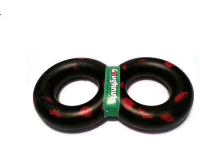 The GoughNuts Tug Toy was designed to address the simple but serious issue of safety. The toy was designed knowing that safety and fun go hand to mouth (a dog's jaw)! The GoughNuts Tug Toy is an interactive tough, durable product. The GoughNuts Tug Toy is for larger dogs. The rubber is the same recipe as used on GoughNuts rings but the outside has been marked with red to show that here is not a safety indicator in this product (as again it is for interactive play versus constant chewing).