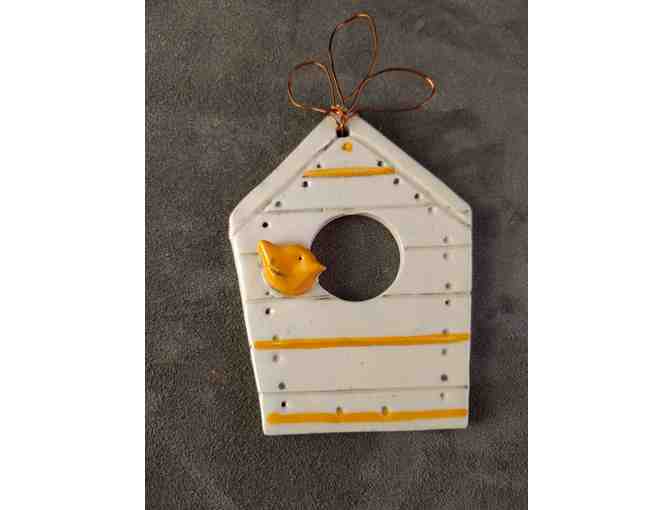 A little "peep" perches on the corner of this delightful ornament by Lincoln artist Karen Prince. One in a series of 8 - each is hand made and hand painted with unique designs and topped with a metal wire accent. 3"x5" including wire.