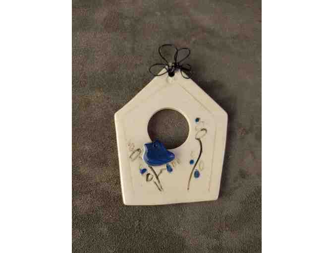 A little "peep" perches on the corner of this delightful ornament by Lincoln artist Karen Prince. One in a series of 8 - each is hand made and hand painted with unique designs and topped with a metal wire accent. 3"x5" including wire.
