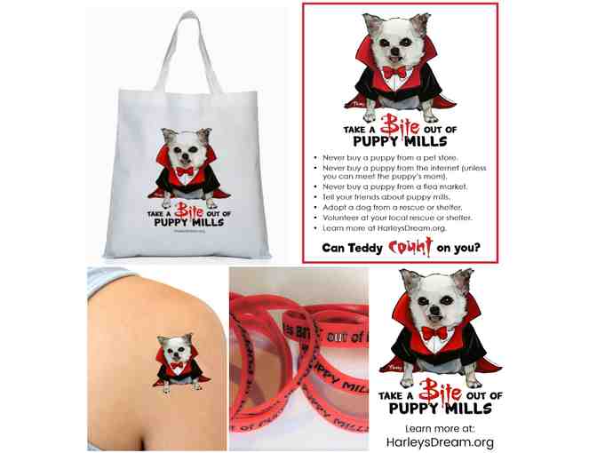 This Halloween help spread the word about puppy mills in a unique and child-friendly way with our "Take a BITE out of Puppy Mills!" items featuring Teddy. There are lots of great items to pass out for trick-or-treaters or during fall events AND spread awareness!  Can Teddy 'Count' on you?