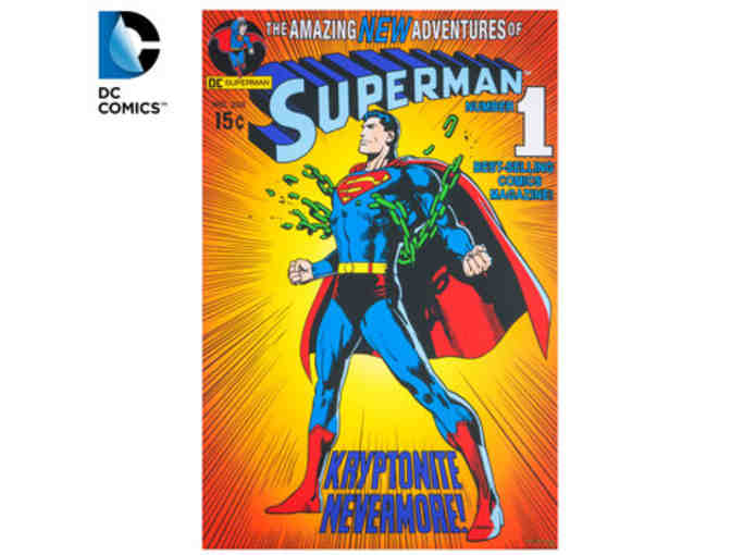 This large wall artwork is made with an MDF frame wrapped in canvas and features a comic cover illustration of Superman breaking free from green chains with a burst of thin, black lines for an action-packed graphic.
