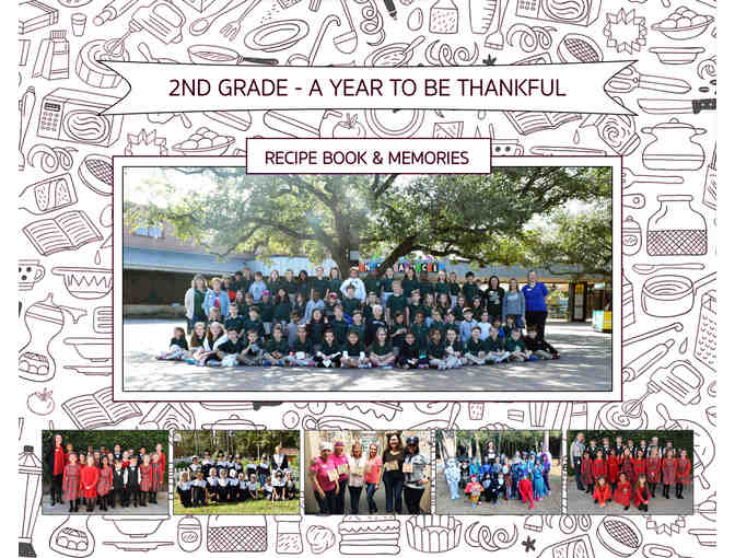 Never be short of ideas for Thanksgiving meals again with the first half of this year's 2nd Grade Memory Book featuring recipes (appetizers/sides, entrees, and desserts) from each of our 2nd graders. The second half of the book features photos from all the fun events, Pilgrims Day, Polar Express Day, to their trip to the Houston Zoo! This year is one book for the whole 2nd grade so they can see all of their friends in one place!