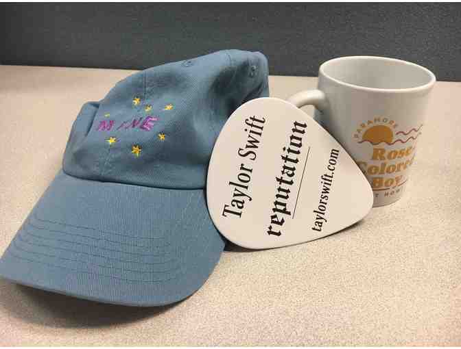 BAZZI HAT, TAYLOR SWIFT GIANT GUITAR PICK AND PARAMORE MUG