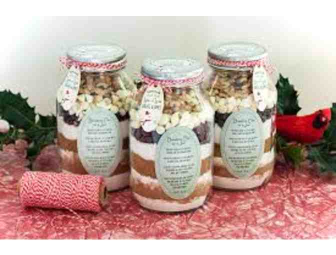 Enjoy homemade brownies and cookies in three separate jars. One jar of brownies with added white chocolate chips; one jar of brownies with peanut butter chips and one jar of Oatmeal Toffee cookies. Directions will be attached. These make nice gifts in the basket or baked!