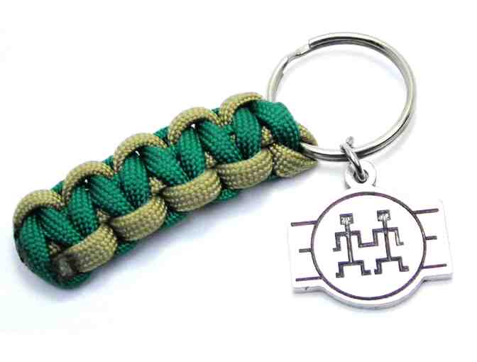 Green and tan paracord braided on a key chain ring, featuring a Camp PARC Est. 1960 charm. Paracord is hand-braided and made in the USA.