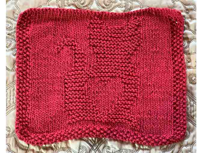 This hand-knit red cotton washcloth features a cat and heart design and makes a perfect stocking stuffer for any feline fanatic!