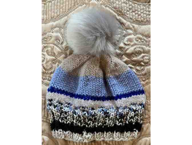 This hand-knit child's winter hat with faux fur pom pom is perfect for keeping your little one warm and cozy during their winter adventures!