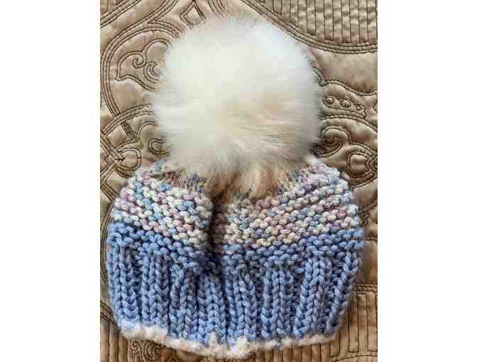 This hand-knit baby's winter hat with faux fur pom pom is perfect for keeping your little one warm and cozy during those winter walks!