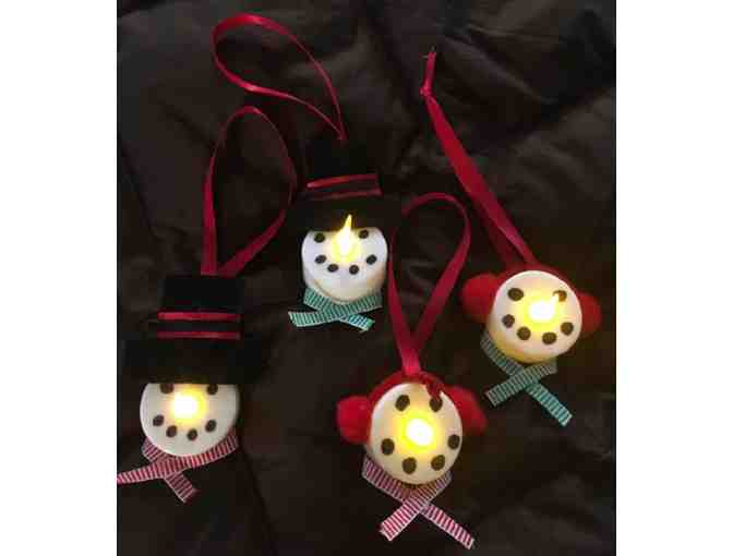 Brighten up your Christmas tree with a homemade light-up snowman ornament! Assorted designs with top hat or ear muffs and red or green scarf colors.