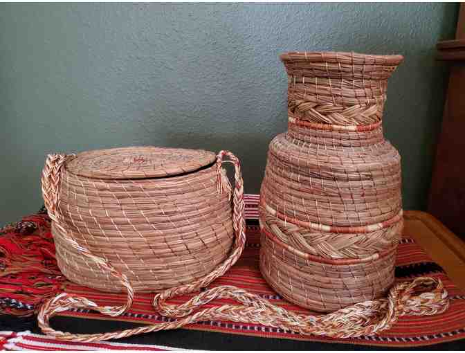 Two handmade pine needle baskets from Michoacan, Mexico