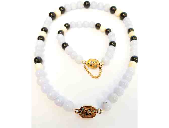 This beaded necklace and bracelet are the perfect power couple to turn any outfit into a classic. The contrasting color beads add style, while the artistic box clasps enhance the easy to wear and secure fastenings with intriguing detail.