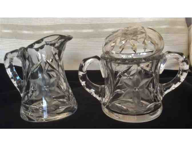 Crystal cream pitcher and dual-handled sugar bowl with floral cut pattern.
