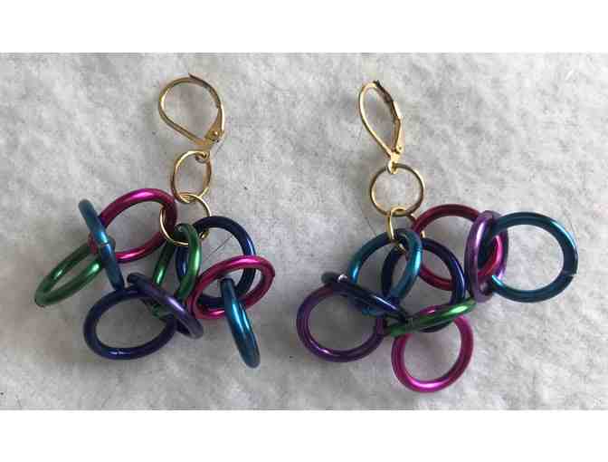 These cute earrings are made of multicolor chainmail that has been attached to a gold leverback. Approx 2 in long