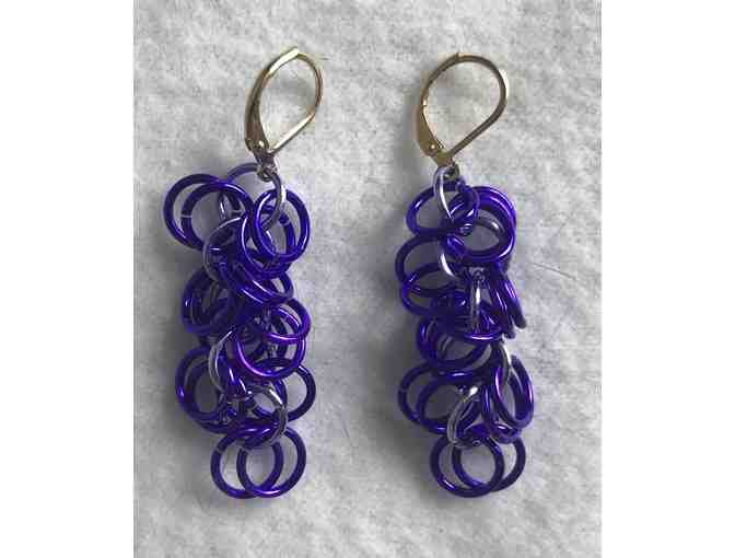 These cuteearrings feature shades of purple chainmail dangling from a goldtoned leaverback. Approx 3 in long