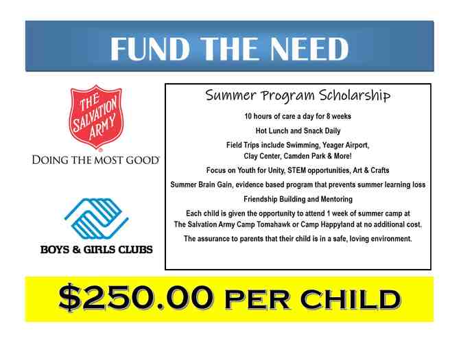 Your donation of $250 will secure a place for one child to attend the 8 week summer programs at The Boys & Girls Club. Many children do not have a place to go during the summer while their parents are at work. Your sponsorship will give a child many great summer opportunities.