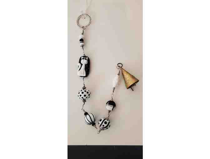 Aprox 16" and features a white cat and a black/white theme with a copper bell at bottom with black/white beads