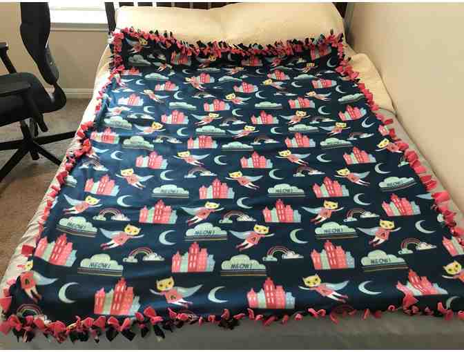 Check out this wonderful handmade blanket that's great for any occasion. Super soft fleece measuring aprox 62" x 54". Makes a great lap quilt to snuggle up in or thow it on your bed for an extra bit of warmth in the winter. Pink backside. Tied edge. Pictured on queen size bed.
