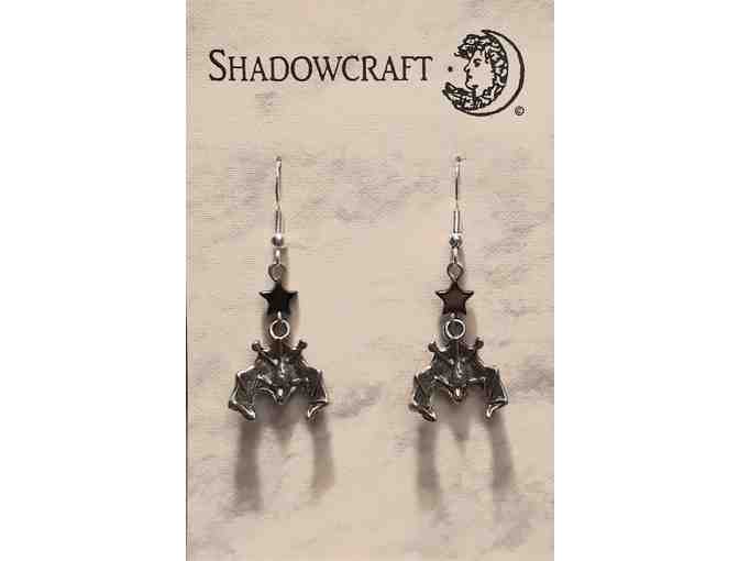 Hanging bat earrings, in silver tone lead-free pewter, with hematite star accent, sterling silver French wires; 1.75" long
