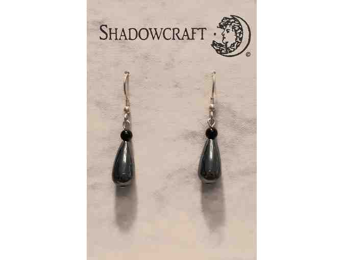 Hematite drop earrings with black onyx accent, sterling silver French wires; 1.5" long