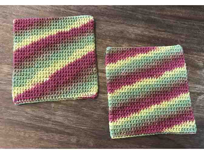 These handmade pot holders are just the thing to add a pop of color to your kitchen. Made from Cotton "Sugar 'n Cream" yarn. Approx 7 in x 7 in. Set of 2.