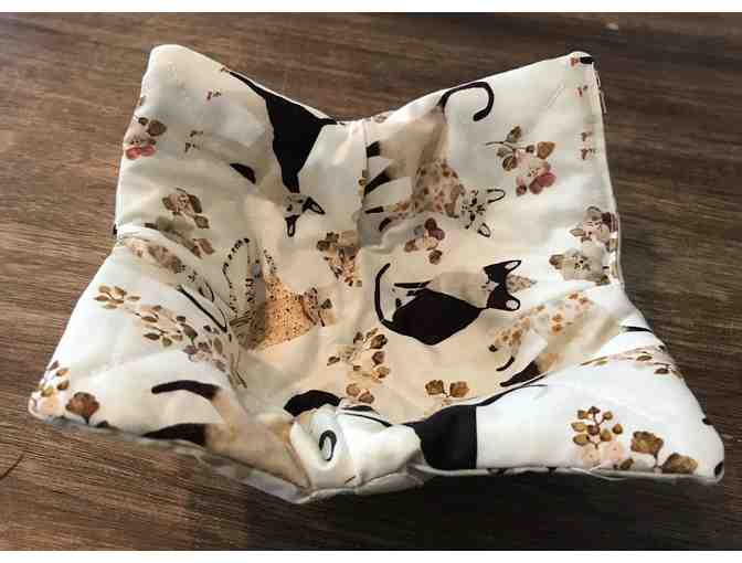 No more burning your finders taking that hot bowl out of the microwave! These reversible and reusable bowl cozy's can be used in the microwave for reheating food. Instead of touching a hot bowl, lift the bowl out with the cozy instead. This is not intended for extended use in the microwave, the maximum time suggested is 3-minute increments. These are also nice for holding a cold bowl of ice cream. These make great unique gifts!