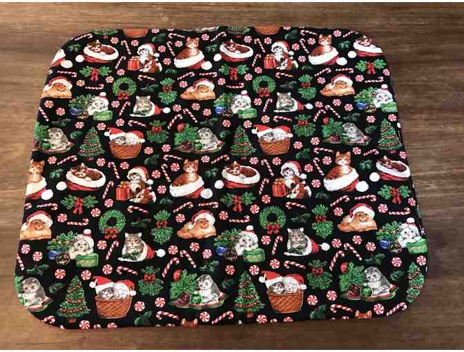 These reversable cat mats are just the thing for your kitties to lounge on or to place under their food and water bowls to avoid making a mess. Good quality fabric. Could also be used as a kennel liner for either cat or dog.