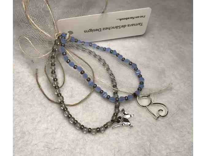 Double, pre-stretched, USA made elastic, stretch bracelets. All are made with glass from the Czech Republic. The charms vary, most are metal with shapes of kitties or eyes or hands. One size fits most.