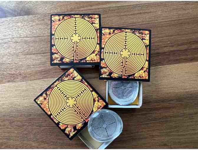 The handcrafted item features a Labyrinth on a square card (with beautiful autumn leaves in the background of the image), adhered to a decorated matchbox. Slide the drawer open to reveal a gorgeous clear stone with a chartres labyrinth shining through!