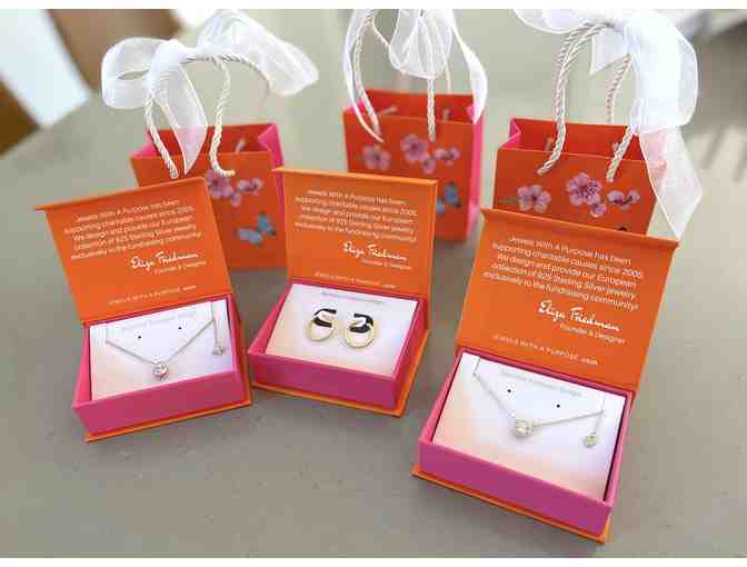 WITH A DONATION EVERYONE WINS! Designed in California and finely crafted in Europe, in solid 925 sterling silver with heavy gold overlay and world-renowned zirconia – the best simulated diamonds ever created! Enjoy a stunning necklace, earrings or bracelet, while supporting a wonderful cause! Each piece, beautifully packaged for gifting and exclusively created for the philanthropic community. Limited opportunities to participate before they sell out.