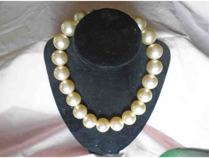 This chunky faux pearl necklace is in a choker style....very nice! it is about 14" in length.