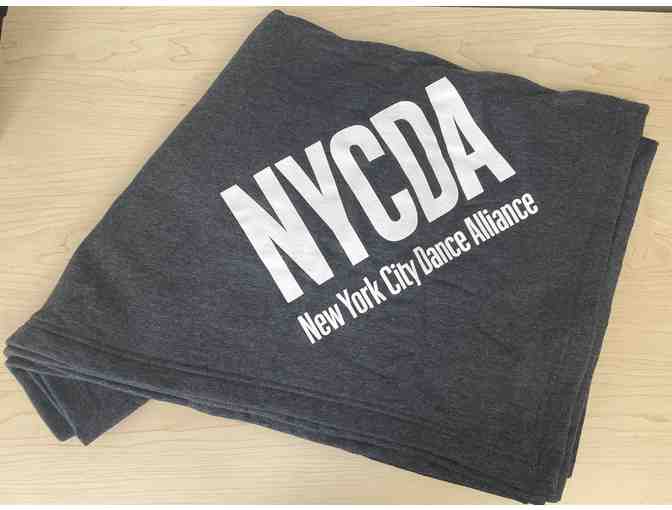 Comfy and cozy dark gray fleece blanket with NYCDA logo.