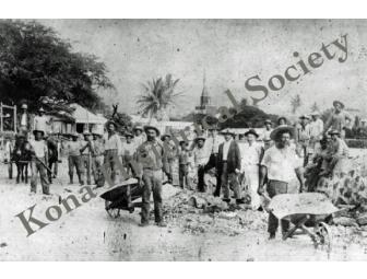 An historical photo showing the building of the Kailua-Kona, Hawai`i seawall. Circa 1860.