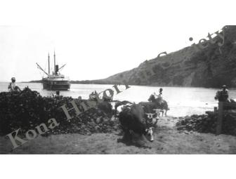 An historical photo depicting cattle shipping in Kealakekua Bay, Hawai`i on Napo`opo`o Beach.