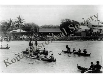 An historical photo of the first King Kamehameha Day Parade in Kailua-Kona, Hawai`i with the royal court paddling into Kailua Bay. June 11, 1914