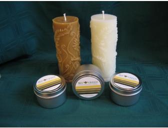A selection of 3 of our BeeGreen travel tins and 2 pure beeswax fern pillars are sure to brighten those long winter nights! Our new line of BeeGreen candles are made from a special blend of soy wax and Maine beeswax for a clean burning candle made from 100% renewable waxes!