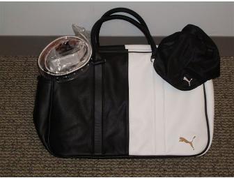 This traditional PUMA Golf Weekender from the 2009 Golf Special Edition Collection is made of soft leather and features contrasting colors. With a shoulder strap and carry handles, this bag is perfect for your weekend golf getaways.