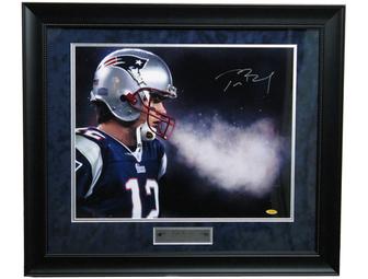 Exclusive 16" x 20" professionally framed and matted Boston Globe Staff Photo signed by Tom Brady. Certificate of Autograph Authenticity provided.