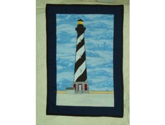 A hand-made, machine stitched, quilted Cape Hatteras Lighthouse wall hanging, bordered in navy blue and backed in cream. Dowel sleeve stitched on back for hanging. Dimensions: 13" X 19"